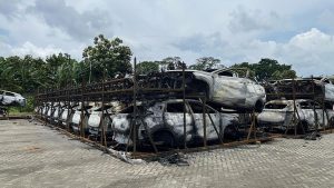 Sebanyak 100 unit KD (Knock-Down) Kit mobil bermesin bensin merek Chery dilalap si jago merah di sebuah gudang penyimpanan milik pihak ketiga yang berlokasi di